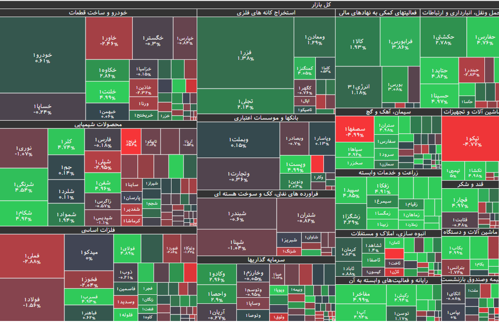 در بازار امروز، بیشترین افزایش قیمت متعلق به نماد وآذر(سرمایهگذاریتوسعهآذربایجان ) با ۴.۹۹ درصد رشد و پس از آن، نمادهای خلنت، رکیش، تپمپی و بکاب بود. همچنین نماد معاملاتی دتماد(تولیدمواداولیهداروپخش ) با ۴.۵۷ درصد، بیشترین کاهش قیمت را داشت و پس از آن نیز، نمادهای دروز، فنورد ، لپارس و ددام قرار گرفتند.