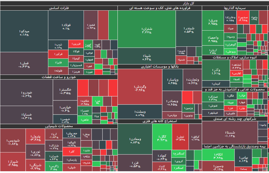 در بازار امروز، بیشترین افزایش قیمت متعلق به نماد کدما(معدنی دماوند) با ۴.۹۹ درصد رشد و پس از آن، نمادهای خاهن، اتکام، کمنگنز و فسازان بود. همچنین نماد معاملاتی بشهاب(لامپ پارس شهاب) با ۴.۹۹ درصد، بیشترین کاهش قیمت را داشت و پس از آن نیز، نمادهای خنصیر، دکوثر ، رکیش و فرآور قرار گرفتند.