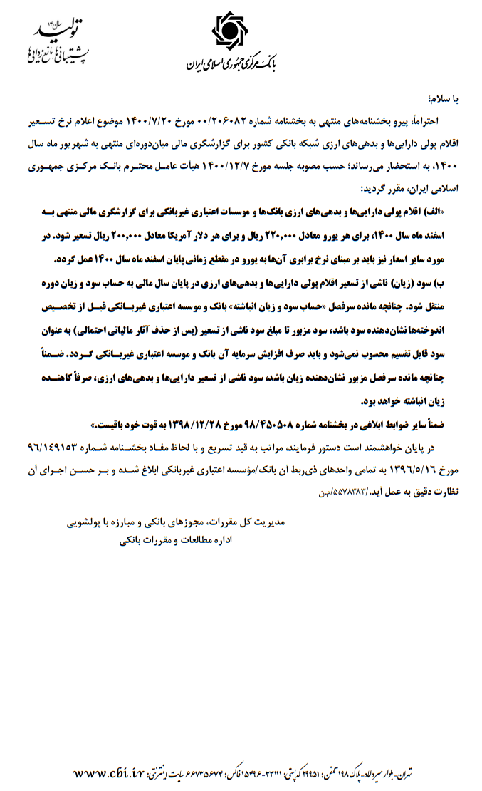 به گزارش ایبِنا به نقل از روابط عمومی بانک مرکزی، این بانک نرخ تسعیر اقلام پولی دارایی ها و بدهیهای ارزی بانکها و موسسات اعتباری غیربانکی برای گزارشگری مالی منتهی به پایان سال مالی ۱۴۰۰ معادل ۲۲۰۰۰۰ ریال برای هر یورو و ۲۰۰۰۰۰ ریال برای هر دلار آمریکا تعیین کرد.