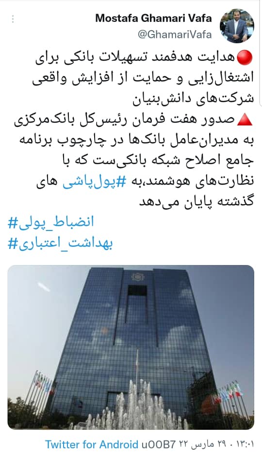 به گزارش ایبِنا؛ مصطفی قمریوفا، مدیر روابط عمومی بانک مرکزی در توئیتی با هشتگ انضباط مالی و بهداشت اعتباری نوشت: هدایت هدفمند تسهیلات بانکی برای اشتغال آفرینی پایدار و حمایت از افزایش واقعی شرکتهای دانشبنیان در دستور کار بانک مرکزی قرار گرفت.