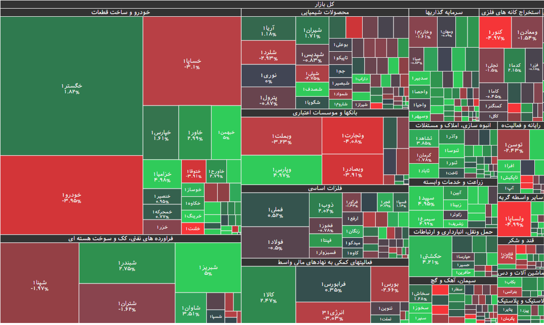 در بازار امروز، بیشترین افزایش قیمت متعلق به نماد غکورش(صنعت غذایی کورش) با ۴.۹۸ درصد رشد و پس از آن، نمادهای کماسه، وپارس، غپینو و غشصفا  بود. همچنین نماد معاملاتی پکرمان(گروه‌ صنعتی‌ بارز) با ۴.۸۴ درصد، بیشترین کاهش قیمت را داشت و پس از آن نیز، نمادهای ساربیل، کنور، ولساپا و سصفها قرار گرفتند.