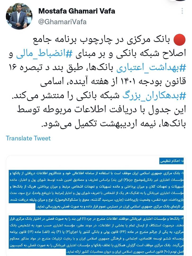 به گزارش ایبِنا؛ مصطفی قمریوفا، مدیر روابط عمومی بانک مرکزی در توئیتی نوشت: بانک مرکزی در چارچوب برنامه جامع اصلاح شبکه بانکی و بر مبنای انضباط مالی و بهداشت اعتباری بانکها، طبق بند د تبصره ۱۶ قانون بودجه ۱۴۰۱ از هفته آینده، اسامی بدهکاران بزرگ شبکه بانکی را منتشر میکند.