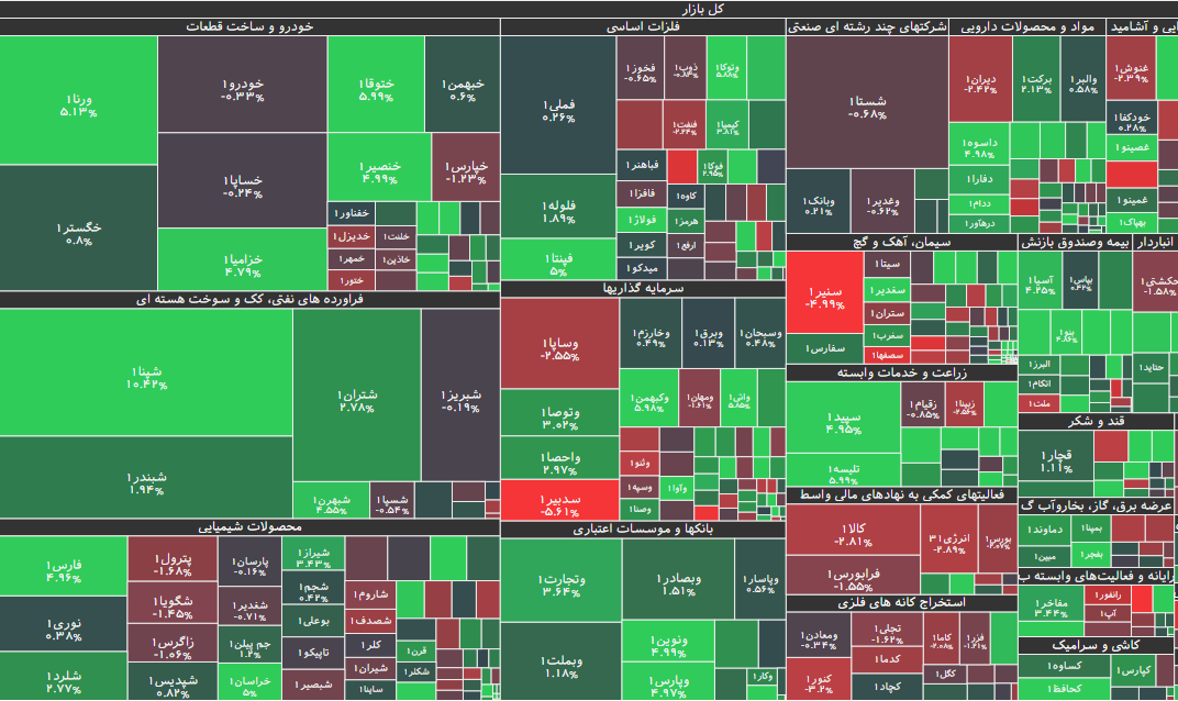 در بازار امروز، بیشترین افزایش قیمت متعلق به نماد پتایر(ایران تایر) با ۱۳.۰۶ درصد رشد و پس از آن، نمادهای شپنا، شپنا، خاهن و واتی بود. همچنین نماد معاملاتی واعتبار(سرمایه گذاری اعتبار ایران) با ۳.۷۹ درصد، بیشترین کاهش قیمت را داشت و پس از آن نیز، نمادهای مرقام، سصفها، بکاب و قثابت قرار گرفتند.