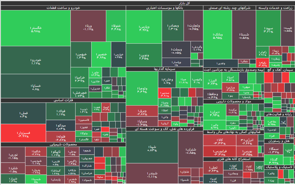 در بازار امروز، بیشترین افزایش قیمت متعلق به نماد شفارس(صنایع شیمیایی فارس) با ۵.۹۸ درصد رشد و پس از آن، نمادهای البرز، دکیمی، وبانک و والبر بود. همچنین نماد معاملاتی سغرب(سیمانغرب ) با ۵.۲۹ درصد، بیشترین کاهش قیمت را داشت و پس از آن نیز، نمادهای نمرینو، سنیر، غدشت و شوینده قرار گرفتند.