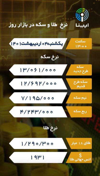 به گزارش خبرنگار ایبِنا؛ در معاملات امروز (یکشنبه ۴ اردیبهشت ماه ۱۴۰۱) بازار طلا و سکه تهران، در حالی که هر اونس طلای جهانی به رقم ۱۹۳۱ دلار رسیده است، هر قطعه سکه تمام طرح قدیم به قیمت ۱۲ میلیون و ۶۹۲ هزار تومان معامله می‌شود. همچنین هر قطعه سکه تمام بهار آزادی طرح جدید (سکه امامی) به رقم ۱۳ میلیون و ۶۱ هزار تومان رسیده است.