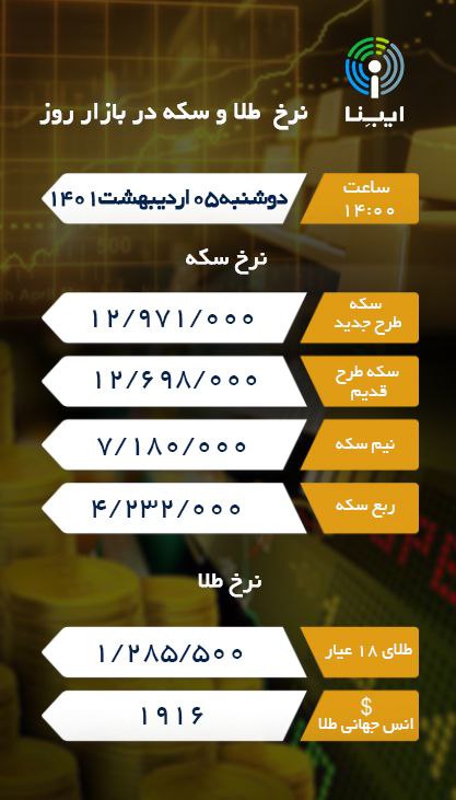 به گزارش خبرنگار ایبِنا؛ در معاملات امروز (دوشنبه ۵ اردیبهشت ماه ۱۴۰۱) بازار طلا و سکه تهران، در حالی که هر اونس طلای جهانی به رقم ۱۹۱۶ دلار رسیده است، هر قطعه سکه تمام طرح قدیم به قیمت ۱۲ میلیون و ۶۹۸ هزار تومان معامله میشود. همچنین هر قطعه سکه تمام بهار آزادی طرح جدید (سکه امامی) با کاهش نسبت به روز قبل، به رقم ۱۲ میلیون و ۹۷۱ هزار تومان رسیده است.