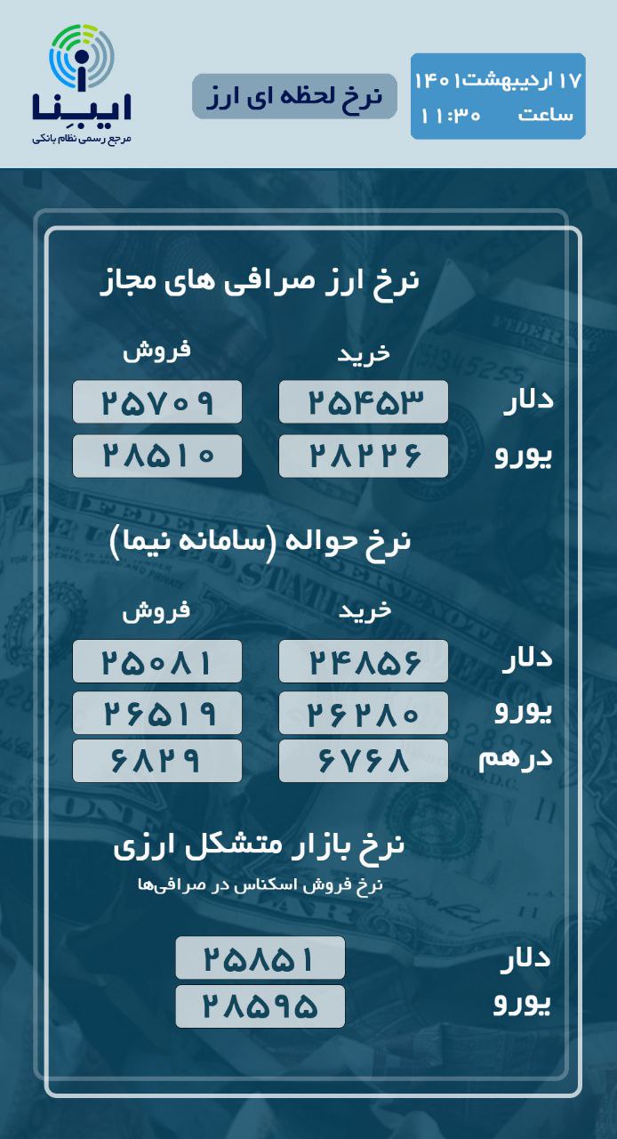 به گونهای که جدیدترین نرخ های اعلام شده در ساعت ۱۱:۳۰ امروز (شنبه ۱۷ اردیبهشت ماه ۱۴۰۱) نشان می دهد میانگین موزون (سامانه سنا بانک مرکزی) خرید هر اسکناس دلار آمریکا در صرافی های مجاز از مردم ۲۵۴۵۳ تومان و میانگین موزون فروش هر اسکناس دلار آمریکا در این صرافی ها به متقاضی خرید ارز، ۲۵۷۰۹ تومان تعیین شده است.