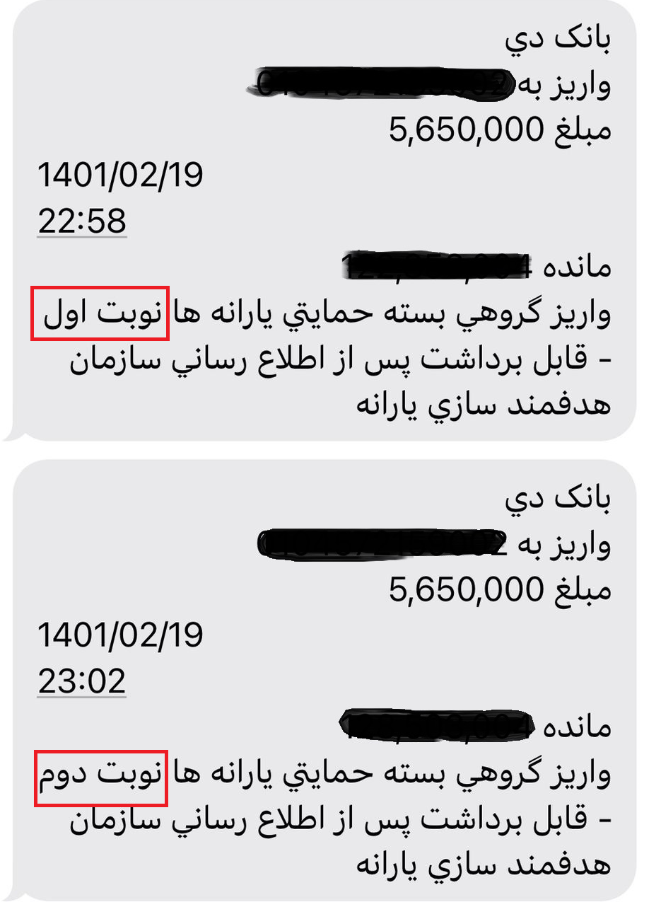 موضوع دیگری که برای مردم سوال ایجاد کرده است، میزان مبلغ واریزی به حساب سرپرستان خانوار است. زیرا بررسی ها نشان می دهد از شب گذشته تا به امروز مبالغ واریزی به حساب سرپرستان، رقمی معادل با دو برابر ۳۰۰ و ۴۰۰ هزار تومان است که بررسی ها نشان می دهد این افزایش مربوط به مبلغ یارانه برای دو ماه است. به عنوان نمونه در تصویر زیر که برای یکی از شهروندان است، مشاهده می شود که مبلغ واریزی برای دو نفر می باشد که با توجه به جایگاه دهک هزینه های که دارند، هر کدام مشمول ۳۰۰ هزار تومان شده اند اما با توجه به قسط وام یک میلیون تومانی کرونا، رقم پرداختی کمتر از ۶۰۰ هزار تومان است. از سوی دیگر، همان طور که در تصویر مشخص است، واریز گروهی بسته حمایتی یارانه ها نوبت اول و نوبت دوم، در نتیجه دولت مبالغ یارانه ای مربوط به دو ماه را یکجا و در یک مرحله واریز کرده است.