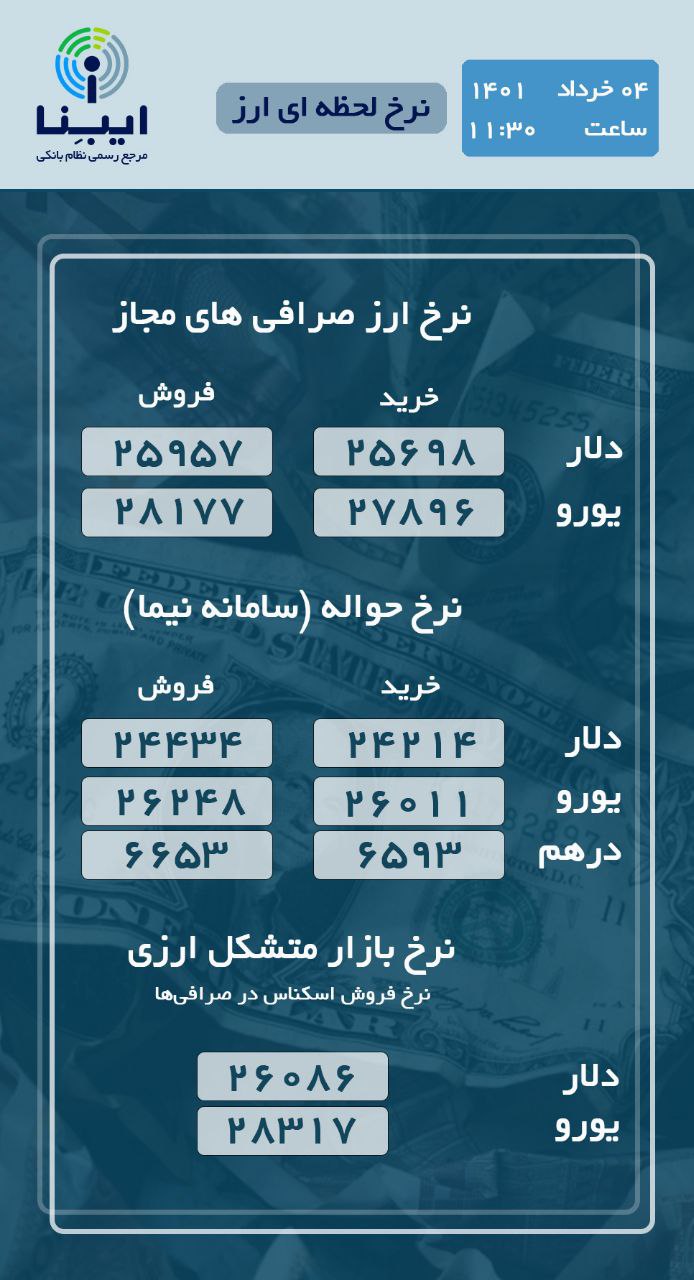 به گونهای که جدیدترین نرخ های اعلام شده در ساعت ۱۱:۳۰ امروز (چهارشنبه ۴ خردادماه ۱۴۰۱) نشان می دهد میانگین موزون (سامانه سنا بانک مرکزی) خرید هر اسکناس دلار آمریکا در صرافی های مجاز از مردم ۲۵۶۹۸ تومان و میانگین موزون فروش هر اسکناس دلار آمریکا در این صرافی ها به متقاضی خرید ارز، ۲۵۹۵۷ تومان تعیین شده است.
