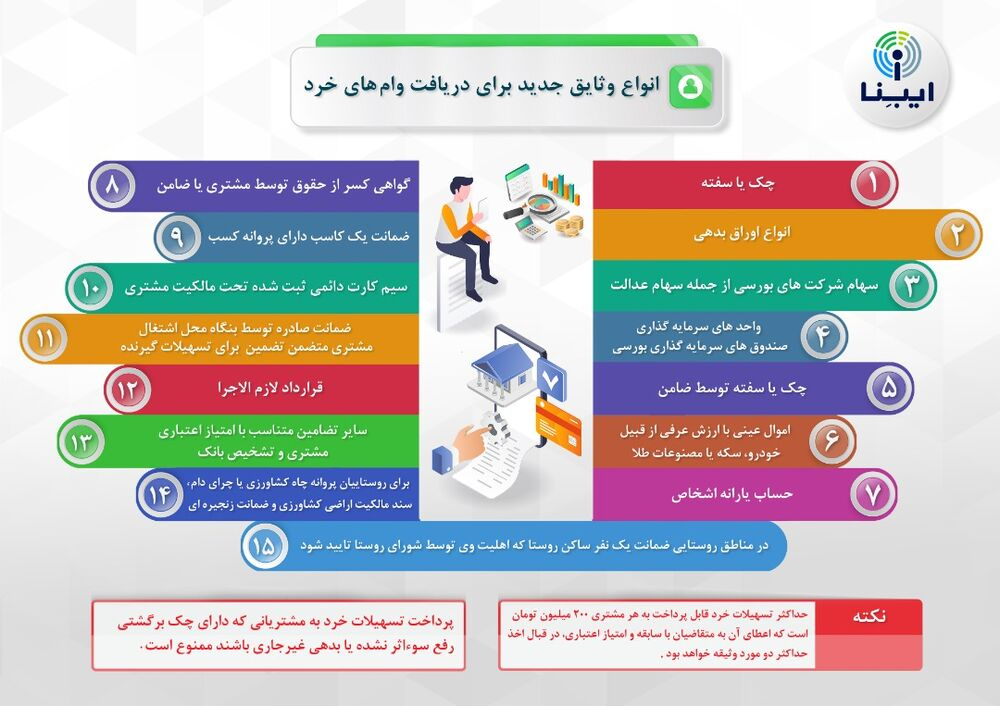 در روش جدید پرداخت تسهیلات خرد، وثایقی همچون سیم‌کارت دائمی، انواع سهام و دارایی‌های ساده‌ای ازاین‌دست جایگزین وثایق سنگین قبلی خواهد شد و هرچه پیشینه اعتباری مشتری بالاتر باشد، وثیقه و ضمانت کمتری نیز از او دریافت خواهد شد.