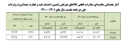 به گزارش ایبِنا، مطابق جدول آماری گمرک در دوماهه نخست سال ۱۴۰۱، میزان صادرات قطعی کالاهای غیرنفتی کشور (بهاستثنای نفت خام، نفت کوره، نفت سفید و همچنین بدون صادرات از محل تجارت چمدانی)، بالغ بر ۱۷ هزار و ۱۴ تن کالا به ارزش هشت میلیارد و ۵۱۶ میلیون دلار بوده است که در مقایسه با مدت مشابه سال ۱۴۰۰، افزایش ۱.۶ درصدی در وزن و ۳۷ درصدی در ارزش داشته است.