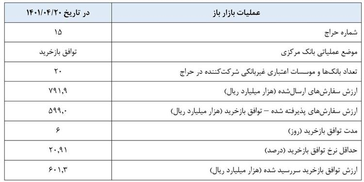 به گزارش ایبِنا به نقل از روابط عمومی بانک مرکزی، گزارش عملیات اجرایی سیاست پولی (۲۰ تیرماه ۱۴۰۱) به شرح زیر است: