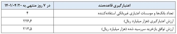 بانکها و موسسات اعتباری غیربانکی میتوانند در روزهای شنبه تا چهارشنبه از اعتبارگیری قاعدهمند (دریافت اعتبار با وثیقه از بانک مرکزی) مشروط به در اختیار داشتن اوراق مالی اسلامی دولتی و در قالب توافق بازخرید با نرخ سقف دالان نرخ سود (۲۲ درصد) استفاده کنند.