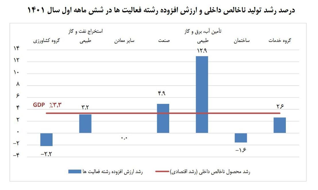 نتایج مذکور حاکی از آن است که در ۶ماهه اول سال ۱۴۰۱ رشته فعالیتهای گروه کشاورزی رشد منفی ٢،٢، گروه صنایع و معادن ۵ درصد (شامل: استخراج نفت خام و گاز طبیعی ۳٫۲، سایر معادن صفر، صنعت ۴٫۹، انرژی ۱۲٫۹ و ساختمان ۱٫۶- درصد) و گروه خدمات ۲٫۶ درصد نسبت به ۶ماهه اول سال ١٤٠٠، رشد داشته است.