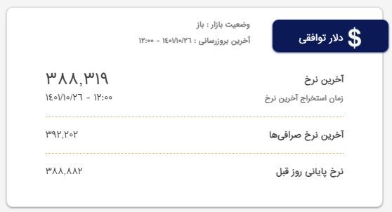 به گزارش خبرنگار ایبِنا؛ امروز؛ دوشنبه ۲۶ دی ماه ۱۴۰۱ قیمت توافقی دلار آمریکا در بازار متشکل ارزی در شرایطی به رقم ۳۸۸۳۱ تومان رسیده است که آخرین نرخ دلار توافقی در صرافی ها، ۳۹۲۲۰ تومان است که نسبت به نرخ پایانی روز قبل حدود ۳۸۹ تومان کاهش یافت.