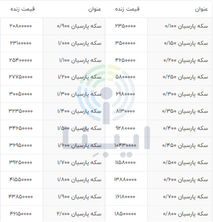 قیمت دیگر اوزان سکه پارسیان در جدول زیر قابل مشاهده است. (قیمتها به ریال است)