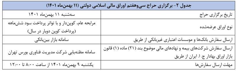 به گزارش ایبِنا، ضمن اعلام نتیجه سیوششمین مرحله از حراج اوراق مالی اسلامی دولتی در سال ۱۴۰۱ (مورخ ۴ بهمن ماه ۱۴۰۱)، به اطلاع میرساند حراج جدید اوراق یاد شده در تاریخ ۱۱ بهمن ماه سال جاری برگزار خواهد شد.