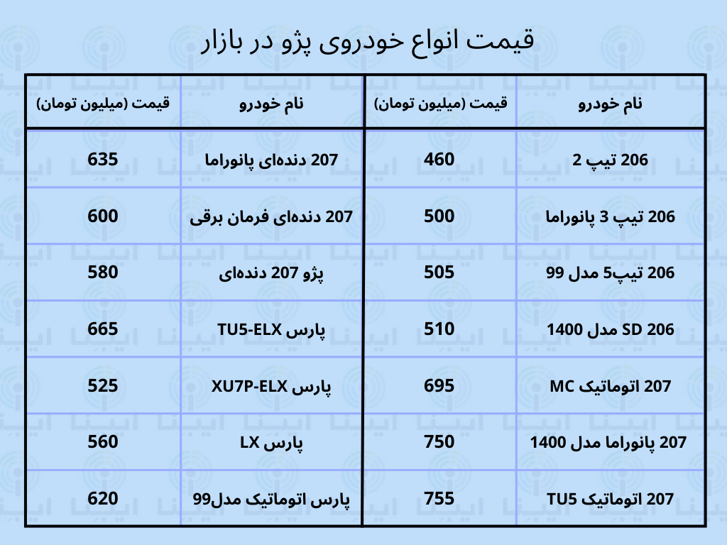قیمت سایر خودروهای پژو در جدول زیر قابل مشاهده است. البته برخی از این خودروها دیگر تولید نمیشوند و قیمت درج شده مربوط به مدلهای تولید شده در سالهای گذشته است که سال تولید خودروهایی که از خط تولید خارج شدهاند در جدول ذکر شده است.