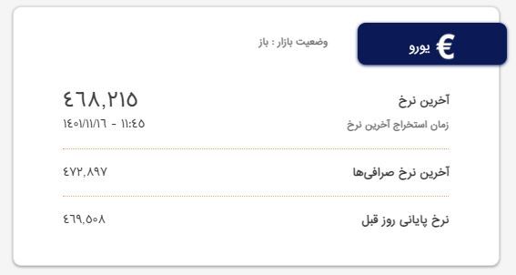 همچنین قیمت هر اسکناس یورو در بازار متشکل ارزی ۴۶ هزار و ۸۲۱ تومان بود که این ارز در صرافیها با قیمت ۴۷ هزار و ۲۸۹ تومان معامله شد.