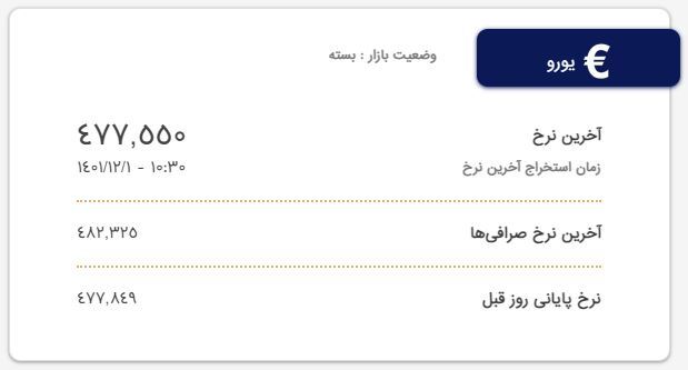 همچنین هر اسکناس یورو در بازار متشکل ارزی در پایان معاملات ۴۷ هزار و ۷۵۵ تومان ارزشگذاری شده است که در تابلوی صرافیهای مجاز به رقم ۴۸ هز و ۲۳۲ تومان رسید.