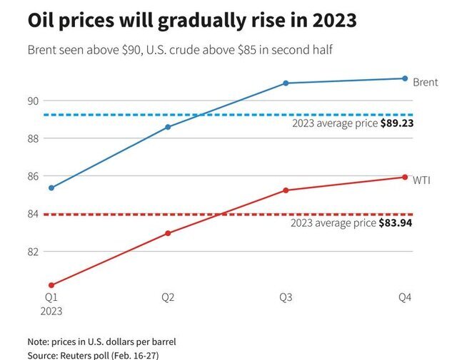 همچنین پیش بینی شد میانگین قیمت هر بشکه نفت وست تگزاس اینترمدیت آمریکا در سال ۲۰۲۳، به ۸۳ دلار و ۹۴ سنت در هر بشکه می رسد که پایینتر از پیش بینی ۸۵ دلار و ۴۰ سنت در نظرسنجی قبلی رویترز است.