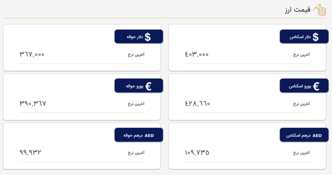 از سوی دیگر قیمت هر اسکناس درهم امارات در این مرکز ۱۰۹۷۳ تومان و نرخ حواله درهم نیز ۹۹۹۳ تومان است که نسبت به روز یکشنبه، کاهش یافته است.