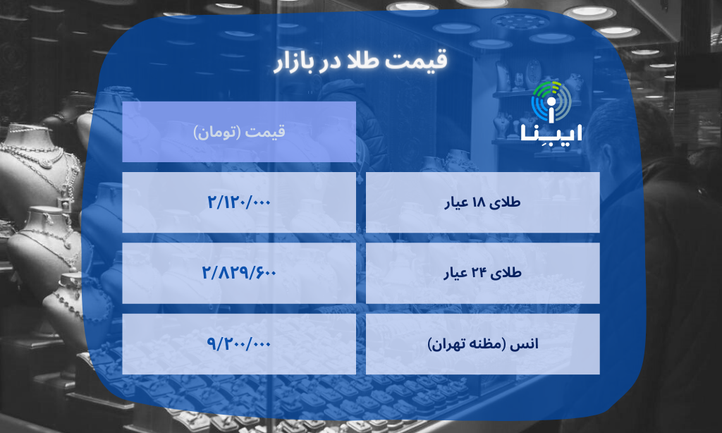 هر گرم طلای ۲۴ عیار نیز به ۲ میلیون و ۸۲۹ هزار و ۶۰۰ تومان رسیده است. مظنه تهران انس طلا در حال حاضر ۹ میلیون و ۲۰۰ هزار تومان است.