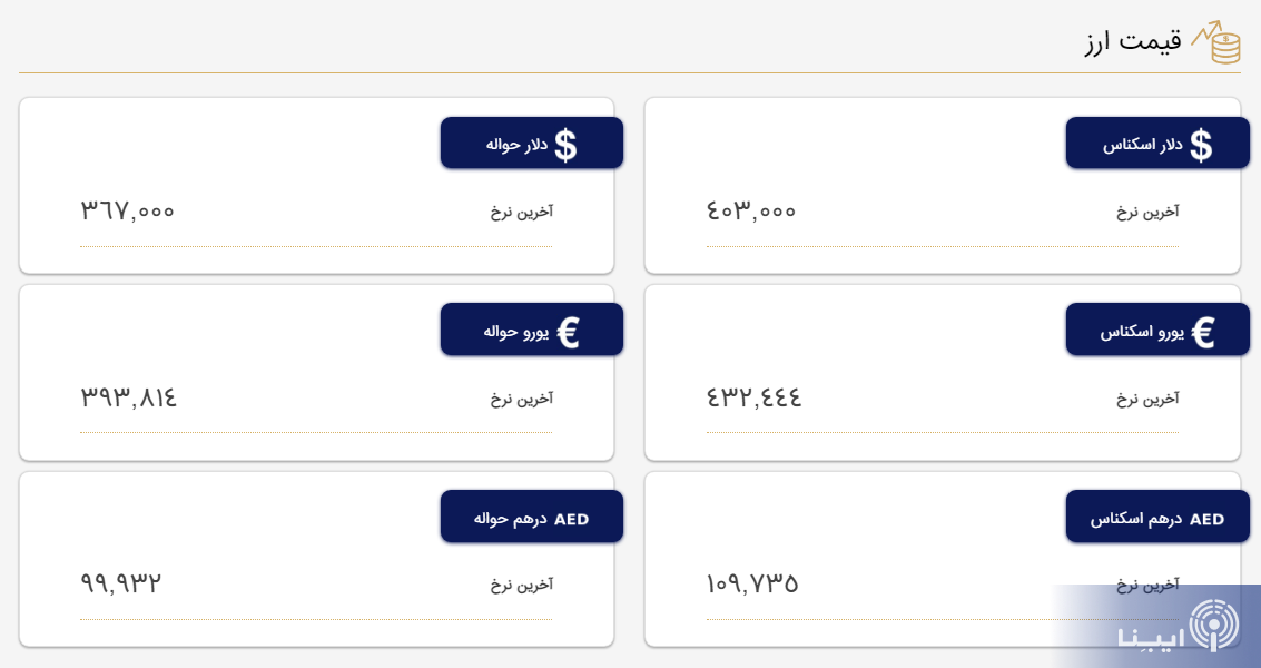 از سوی دیگر، هر اسکناس درهم امارات در مرکز مبادله ایران ۱۰۹۷۳ تومان ارزش گذاری شده است. این در حالی است که نرخ حواله درهم نیز به رقم ۹۹۹۳ تومان رسیده است.