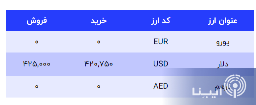 در لحظه انتشار این گزارش، هر اسکناس دلار آمریکا در تابلوی صرافی ملی به نرخ ۴۲۰۷۵ تومان خریداری و به قیمت ۴۲۵۰۰ تومان به متقاضی ارز فروخته میشود.