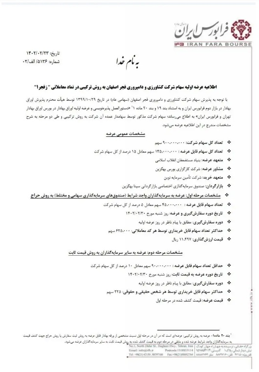 شرکت فرابورس ایران اطلاعیه عرضه اولیه سهام شرکت کشاورزی و دامپروری فجر اصفهان به روش ترکیبی در نماد معاملاتی «زفجر۱» را منتشر کرد.