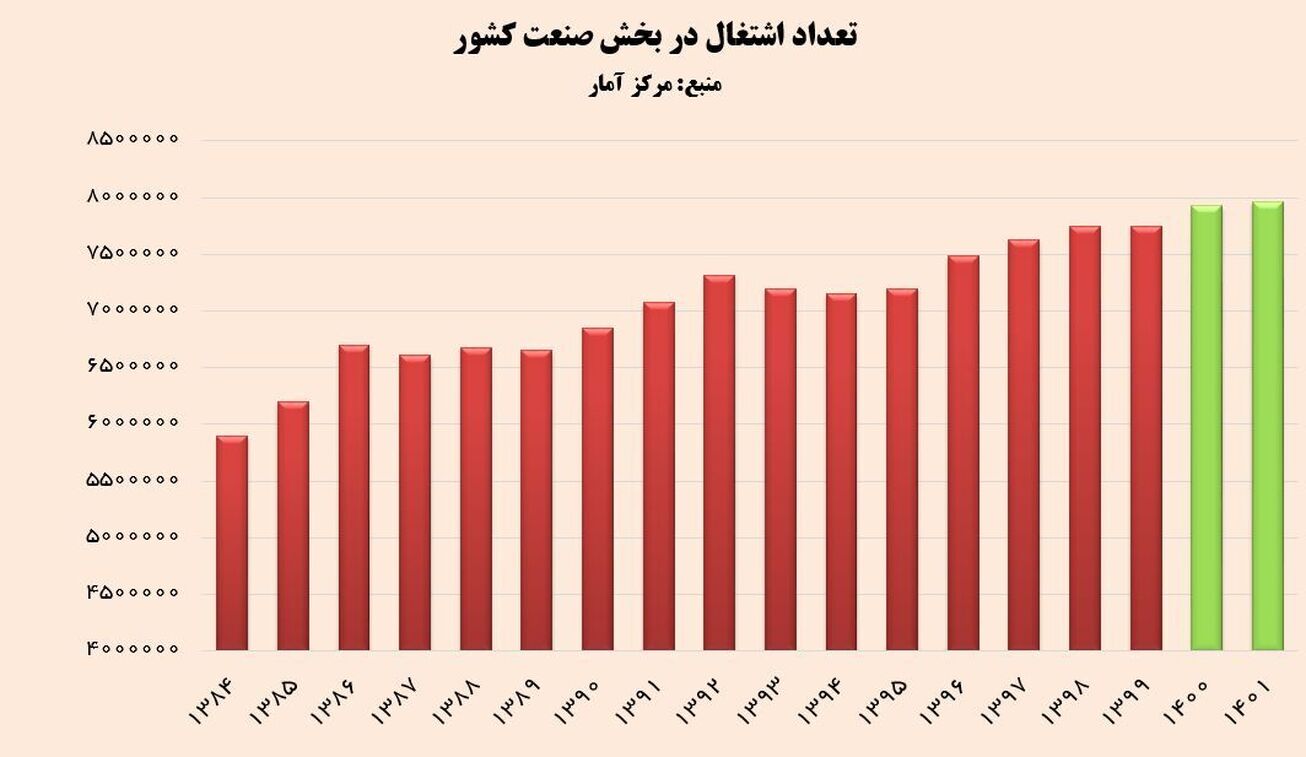 بررسی آمار نیروی کار که توسط مرکز آمار ایران منتشر شده است نشان میدهد، در سال ۱۴۰۱ اشتغال در بخش صنعت کشور به ۷ میلیون و ۹۶۳ هزار نفر بالغ شده است.