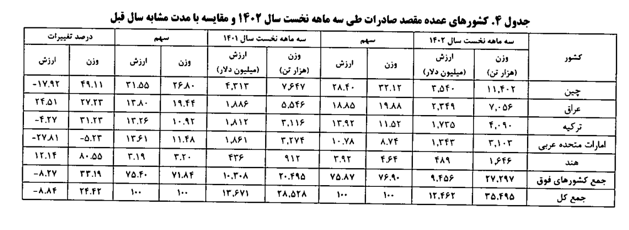 این پنج کشور، در مجموع سهمی در حدود ۷۶.۹ درصد از وزن و ۷۵.۸۷ درصد از کل ارزش صادرات کشور را به خود تخصیص داده شد.