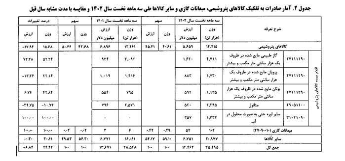 لازم به ذکر است به دلیل کاهش قیمت‌های جهانی برخی از کالا‌های صادراتی از جمله محصولات پتروشیمی (از نظر وزنی ۱۶ درصد افزایش، اما از نظر ارزش ۱۸ درصد کاهش داشته است)، میزان کلی صادرات کشور با چنین تغییرات وزنی و ارزشی مواجه شده است.