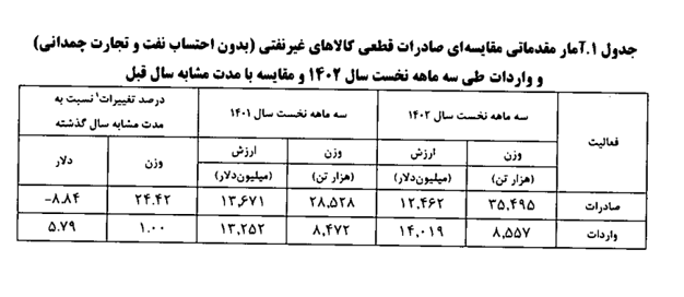 به گزارش ایبِنا، بر اساس اعلام گمرک جمهوری اسلامی ایران در سه ماه نخست امسال میزان صادرات قطعی کالا‌های غیر نفتی کشور (به استثنای نفت خام، نفت کوره و نفت سفید وهمچنین بدون صادرات از محل تجارت چمدانی)، بالغ بر ۳۵.۵ میلیون تن و به ارزش ۱۲.۵ میلیارد دلار بوده است که در مقایسه با مدت مشابه سال ۱۴۰۱ افزایشی ۲۴.۴۲ درصدی در وزن و کاهشی ۸.۸۴ درصدی در ارزش دلاری داشته است.