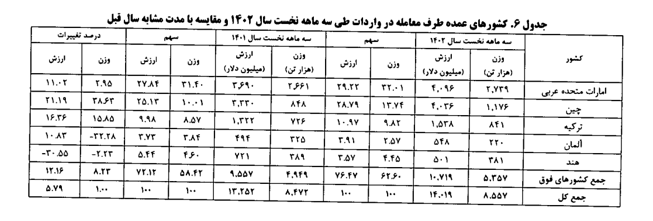 این پنج کشور در مجموع از نظر وزنی ۶۲.۶۰ درصد و از نظر ارزشی ۷۶.۴۷ درصد از کل واردات کشور را به خود اختصاص داده اند.
