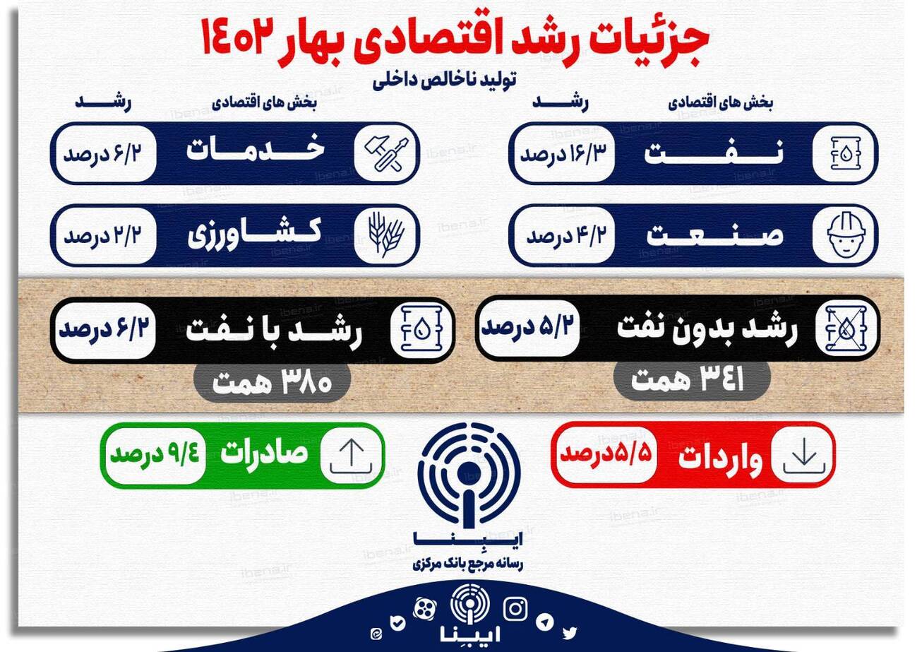 در بهار سال ۱۴۰۲ رشد ۶.۲ درصد در کل اقتصاد و ۵.۲ درصد برای بخش غیرنفتی ثبت شد که این نرخها بیش از ۳ برابر سال ۱۴۰۱ هستند.