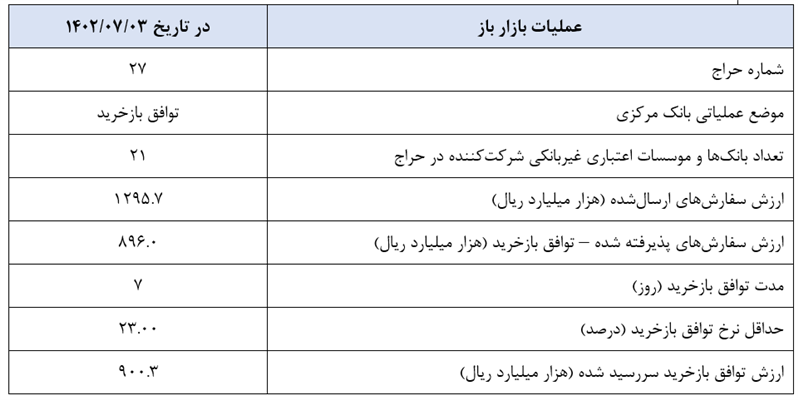 گزارش عملیات اجرایی سیاست پولی (۰۳ مهرماه ۱۴۰۲) به شرح زیر است: