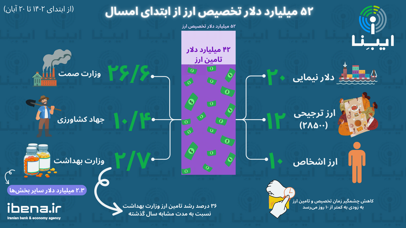 میزان تخصیص ارز از ابتدای امسال تا ۲۰ آبان ماه به حدود ۵۲ میلیارد دلار میرسد که از این میزان ۴۲ میلیارد دلار تامین شده است.