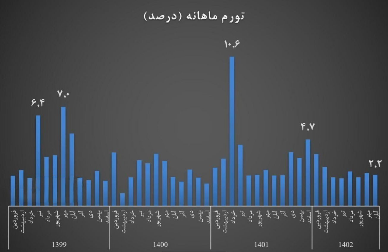 منظور از تورم ماهانه، درصد تغییر عدد شاخص قیمت، نسبت به ماه قبل است. در آبان ماه ١٤٠٢ تورم ماهانه خانوارهای کشور برابر ٢،٢ درصد بوده است که نسبت به تورم ۲.۳ درصدی مهر ماه، کاهش ۰.۱ واحد درصدی را نشان میدهد. تورم ماهانه آبان برای گروههای عمده «خوراکیها، آشامیدنیها و دخانیات»، ١.٠ درصد و برای گروه عمده «کالاهای غیرخوراکی و خدمات»، ٢.٧ درصد بوده است.