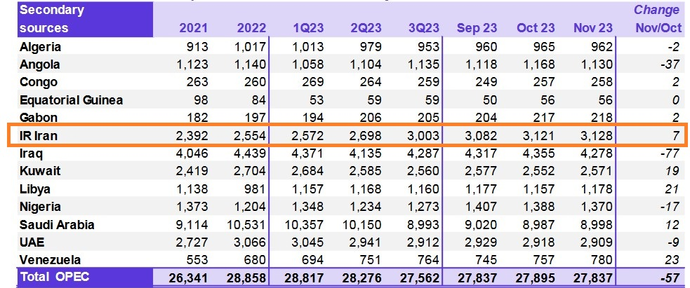بر اساس این گزارش، تولید نفت ۱۳ کشور عضو این سازمان در ماه نوامبر ۲۰۲۳ (آبان ۱۴۰۲) ۲۷ میلیون و ۸۳۷ هزار بشکه در روز عنوان شده است که کاهش روزانه ۵۷ هزار بشکهای نسبت به ماه اکتبر را نشان میدهد.