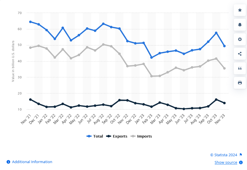 به گزارش ایبنا؛ پایگاه آماری استاتیستا (statista) جدول زمانی از کل ارزش ماهانه تجارت کالا (صادرات و واردات) میان ایالات متحده آمریکا و چین از نوامبر ۲۰۲۱ تا نوامبر ۲۰۲۳ منتشر کرده است.