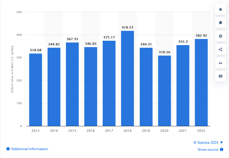 استاتیستا (statista) در آماری دیگر به تراز تجاری منفی آمریکا در تجارت با چین پرداخت. منظور از تراز تجاری منفی این است که واردات بر صادرات غلبه داشته باشد. اختلاف میان واردات و صادرات اگر منفی باشد، کسری تجاری (trade deficit) رخ داده است. این جدول زمانی برای بازه ۲۰۱۳ تا ۲۰۲۲ میلادی است.