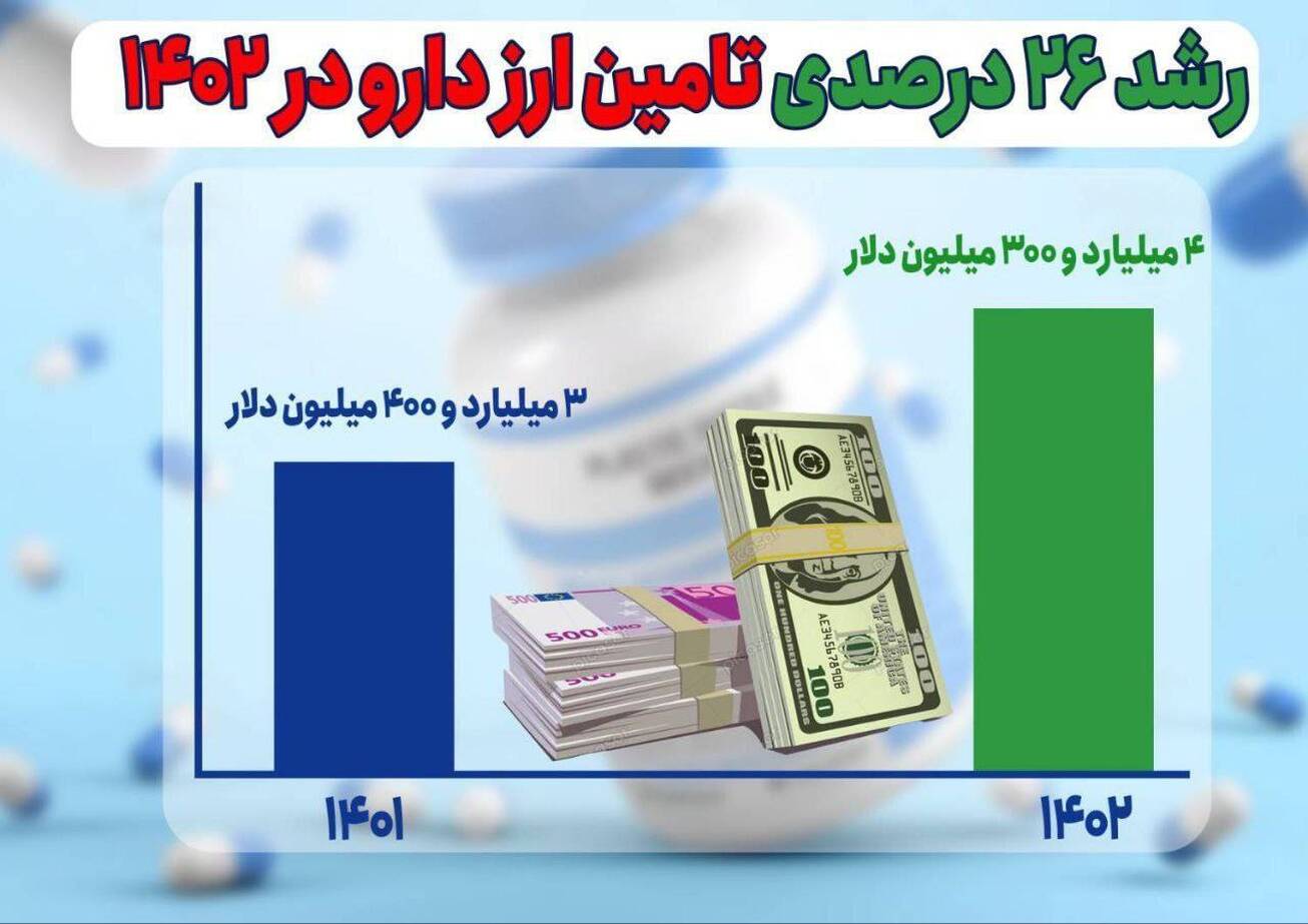 بانک مرکزی در سال ۱۴۰۲ بیش از ۴ میلیارد و ۳۰۰ میلیون دلار ارز برای واردات دارو تامین کرده که نسبت به سال ۱۴۰۱ رشد ۲۶ درصدی داشته است.