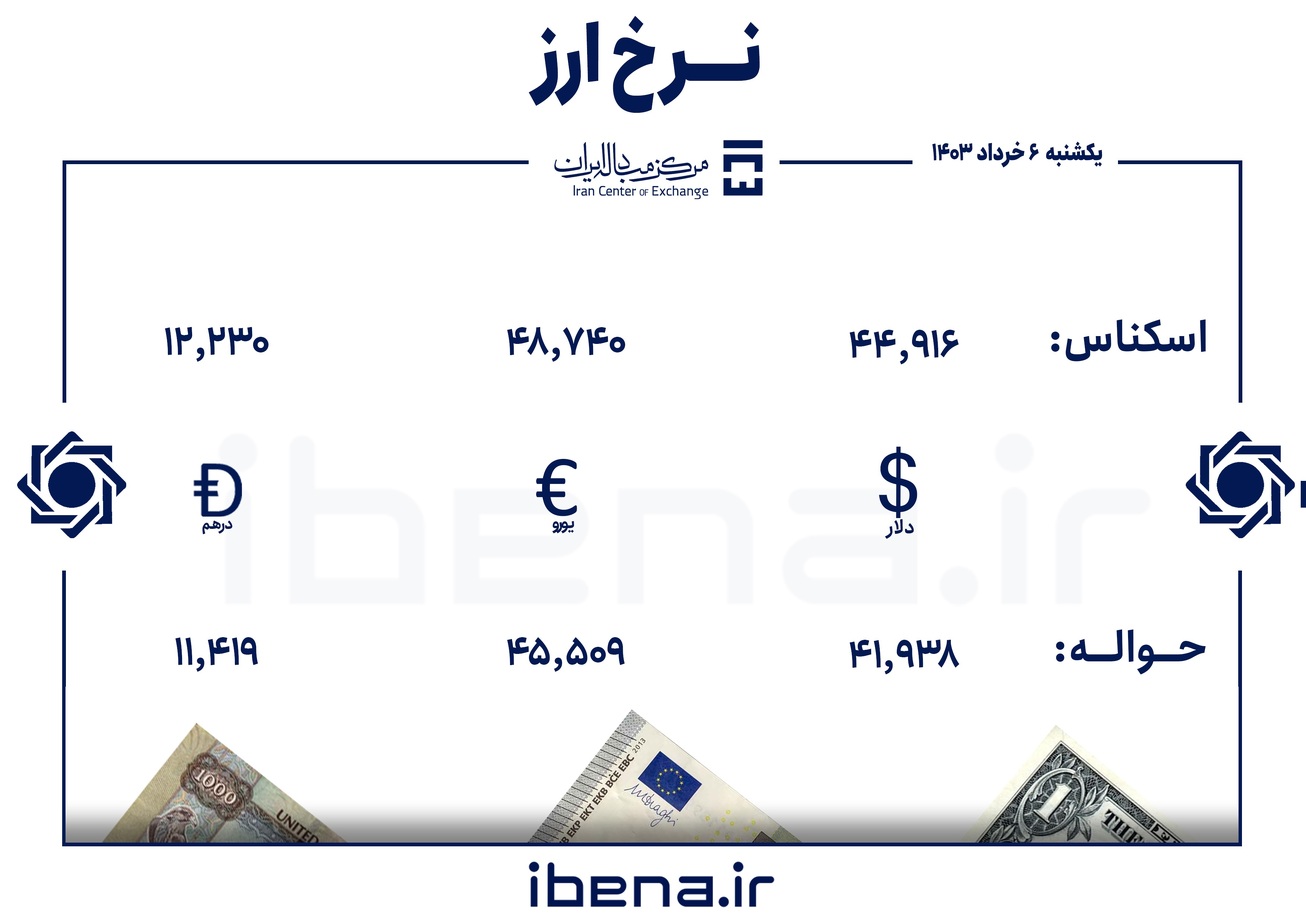 از سوی دیگر اسکناس درهم امارات ۱۲ هزار و ۲۳۰ تومان ارزشگذاری شده و نرخ حواله درهم نیز ۱۱ هزار و ۴۱۹ تومان است.