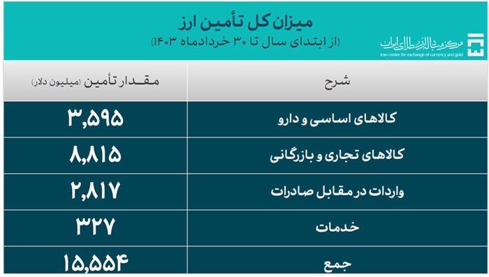به گزارش ایبنا، اصغر بالسینی سخنگوی مرکز مبادله ارز و طلای ایران گفت: برای کالاهای اساسی ۳ میلیارد و ۵۹۵ میلیون دلار، برای کالاهای تجاری و بازرگانی مبلغ ۸ میلیارد و ۸۱۵ میلیون دلار و برای خدمات ۳۲۷ میلیون دلار و برای واردات در مقابل صادرات ۲ میلیارد و ۸۱۷ میلیون دلار تامین ارز صورت گرفت.