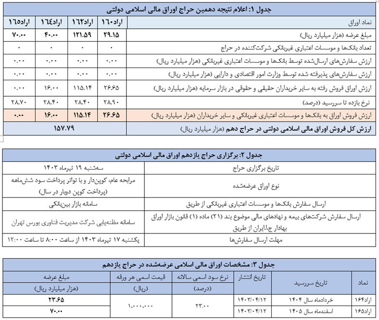 به گزارش ایبنا، نتیجه دهمین مرحله از حراج اوراق مالی اسلامی دولتی در سال ۱۴۰۳ (مورخ ۱۲تیر ماه ۱۴۰۳) اعلام شد، همچنین تاریخ برگزاری حراج جدید اوراق یاد شده در تاریخ ۱۹ تیرماه سال جاری خواهد بود.