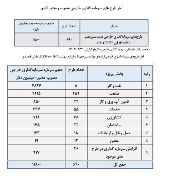 طبق گزارشی که وزارت اقتصاد تهیه کرده، حجم سرمایه گذاری مصوب معتبر در بخش نفت و گاز ۴۸۲۶ میلیون دلار، در بخش صنعت ۴۲۱۵ میلیون دلار، در بخش تأمین آب، برق و گاز ۸۵۰ میلیون دلار، در بخش خدمات ۶۳۷ میلیون دلار، در بخش کشاورزی ۷۱۸ میلیون دلار، در بخش ساختمان ۱۷۵ میلیون دلار، حمل و نقل و ارتباطات ۱۴۳ میلیون دلار، معدن ۱۹ میلیون دلار و افزایش سرمایه گذاری در طرحهای موجود ۲۱۷ میلیون دلار بوده است.