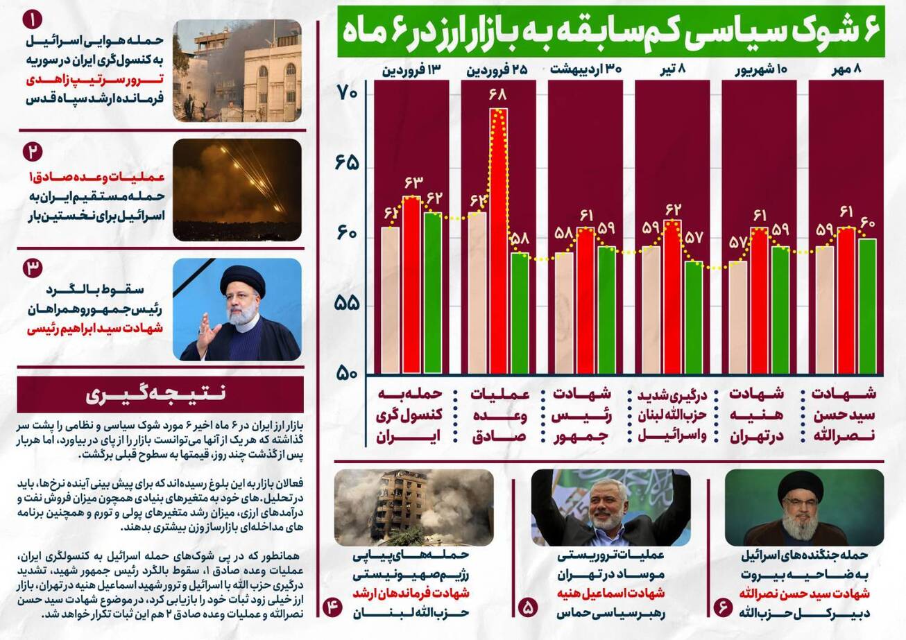 بازار ارز در ۶ماهه اول، ۶شوک سیاسی را پشت سر گذاشت که هر یک میتوانست بازار را از پای در بیاورد؛اما هربار قیمتها به سطح قبلی برگشت.