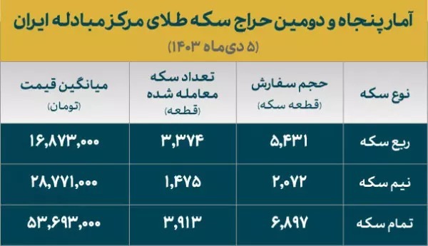 همچنین، از مجموع ۲۰۷۲ قطعه نیم سکه ثبت سفارش شده، ۱۴۷۵ قطعه با میانگین قیمت ۲۸ میلیون و ۷۷۱ هزار تومان به متقاضیان تخصیص داده شد.