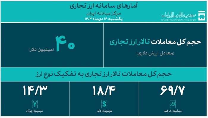 به گزارش ایبنا، بر اساس اعلام بانک مرکزی، معادل ارزش دلاری حجم معاملات تالار ارز تجاری در روز ۱۶ دی ماه سال جاری، ۴۰ میلیون دلار بوده است و براین اساس در این روز ۶۹.۷ میلیون درهم، ۱۸.۴ میلیون دلار و ۱۴.۳ میلیون یوآن مورد معامله قرار گرفته است.